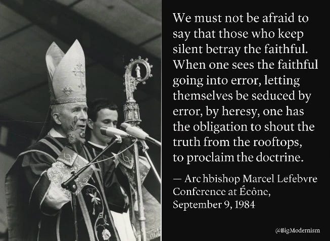 „Nesmíme se bát říkat, že ti, kdo mlčí, zrazují věřící. Když člověk vidí, že věřící upadají do omylu, že se nechávají svést omylem, herezí, má povinnost křičet pravdu ze střech, hlásat nauku.“ – arcibiskup Lefebvre