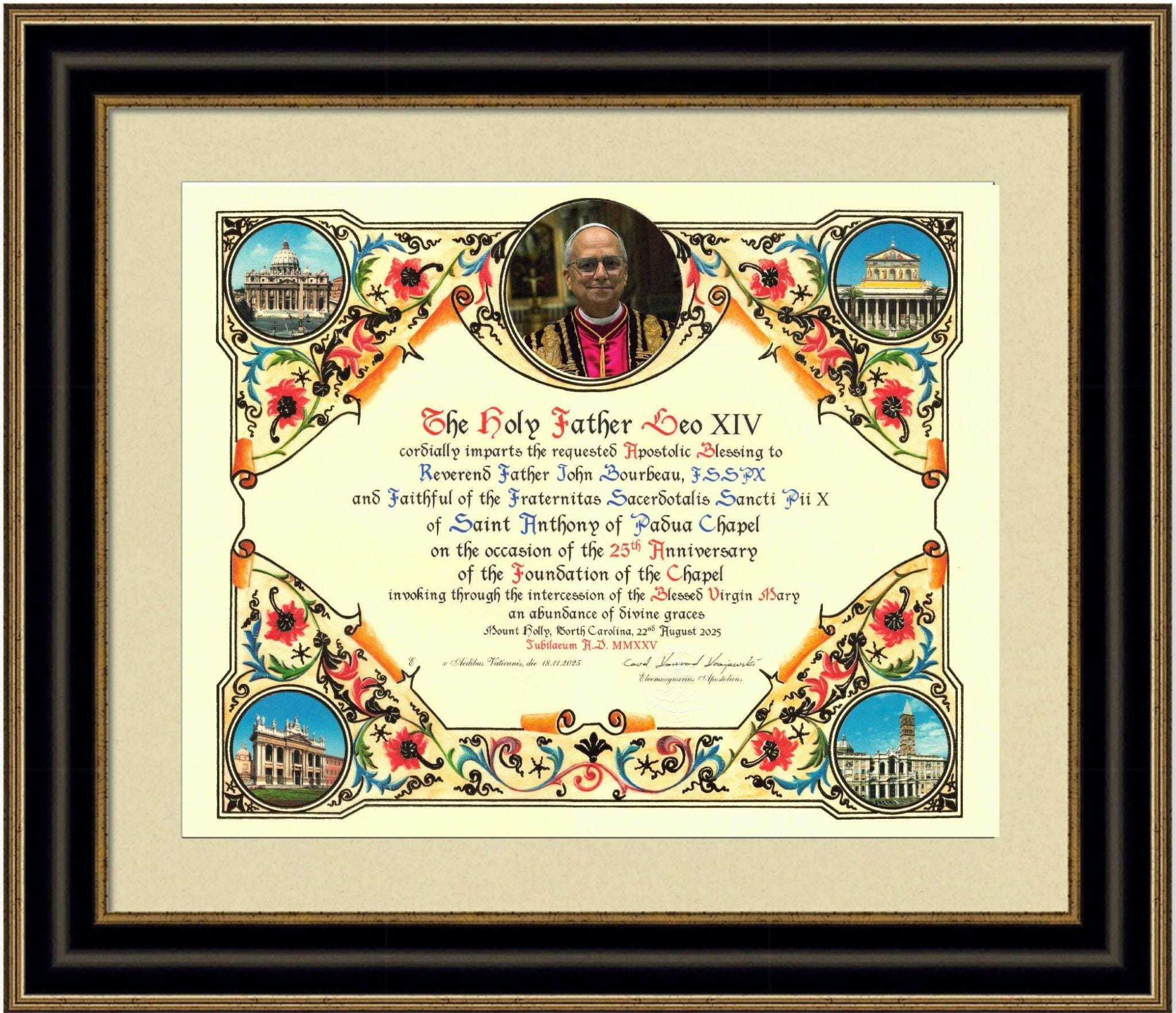 A teď má přinejmenším jedna kaple FSSPX krásnou oficiální listinu s papežským požehnáním od almužníka, celou vyvedenou kaligraficky a v mariánském jazyce, připravenou k zarámování a zavěšení ve vestibulu.